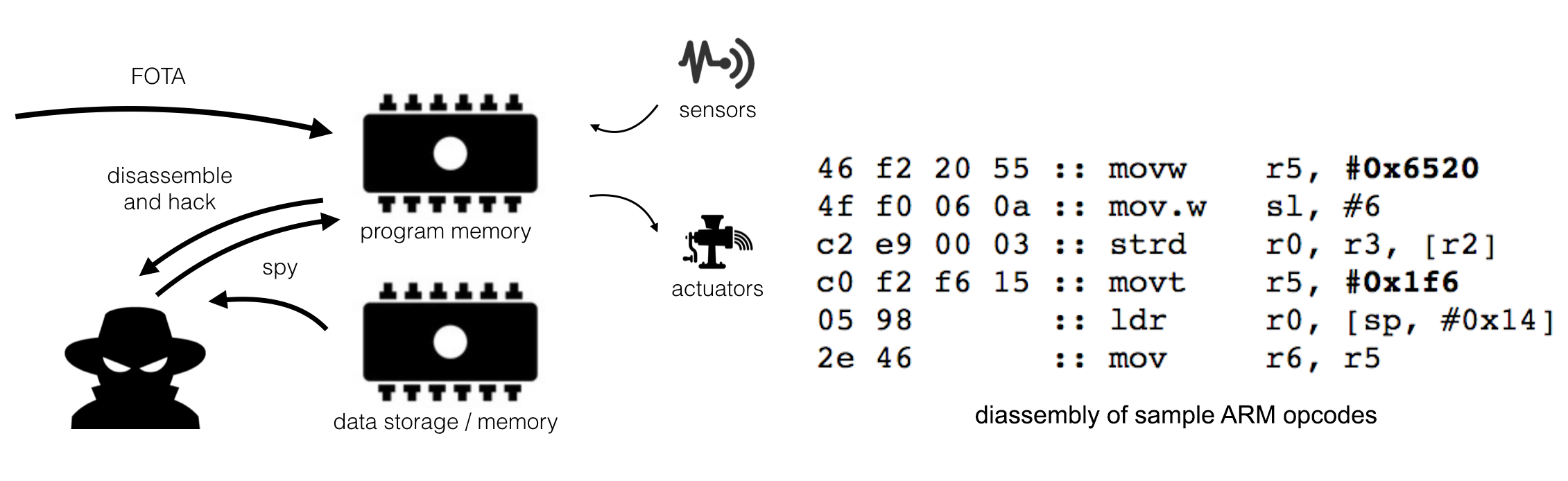 When targetting a specific CPU on an IoT device; the business logic and application are compiled into well known and common CPU opcodes (such as avr, ARM or MIPS) - which when executed on the device perform specific operations. Extracting the information from memory chips is not difficult; and in doing so the contents can be easily reverse engineered using any number of developer tools.