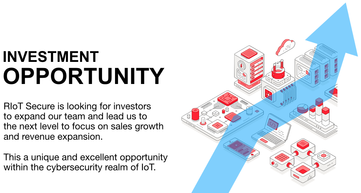 RIoT Secure is looking for investors and a new Chief Executive Officer to lead us to the next level to focus on sales and growth revenue. This is a unique and excellent opportunity within the cybersecurity realm of IoT.